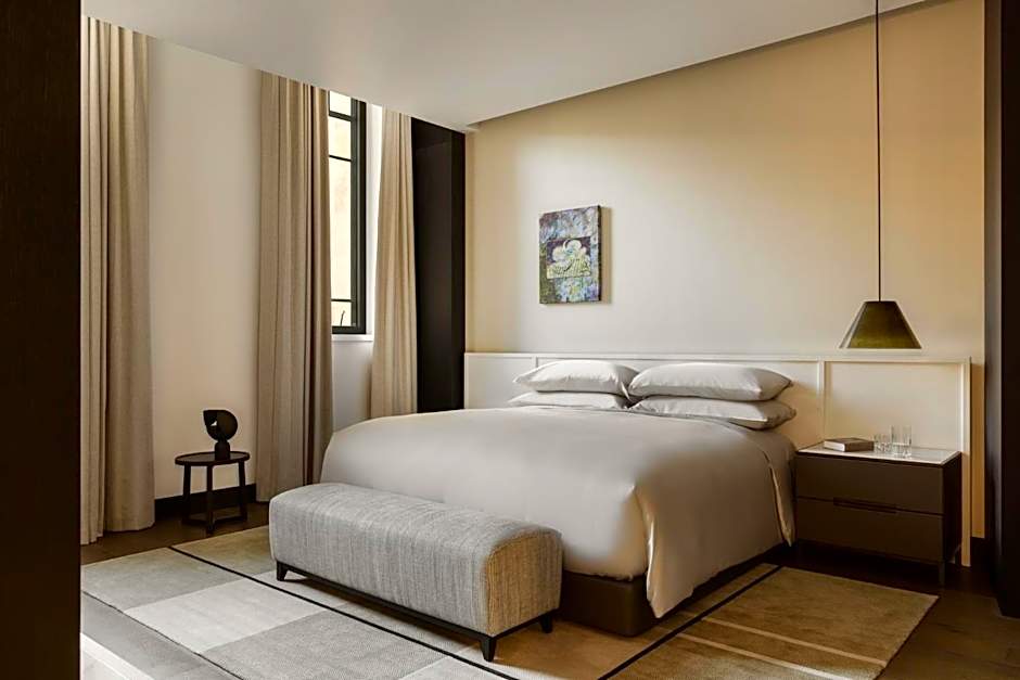 Averaging 276 ft² of bespoke luxury, the Deluxe King suite features a separate living room and bedroom. Offering a sense of spaciousness, the interiors honor the rich history of the building with high ceilings, soft textures and neutral tones. Custom furnishing, curated artwork and ambient lighting create a relaxing retreat. The opulent oversize bathroom consists of double vanities, dual head rain shower and deep soaking oval bathtub with exclusive Haeckels amenities. Intuitive technology allows guests to control lighting, multi-layered curtains, temperature and 24-hour in-room dining from the touch of a tablet, while the personal bar presents a curation of locally sourced products to enjoy in-room.